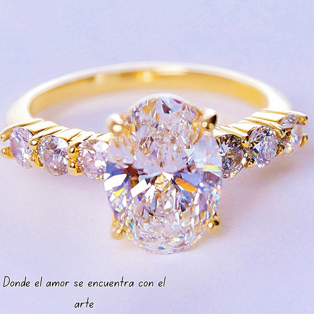 “Elegancia atemporal elaborada en cálido oro amarillo: Una obra maestra de talla ovalada de Ferrara Jewelers”.