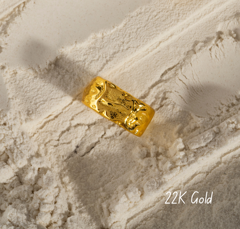 24K gold is gold in its purest state. It features an intense orange-yellow hue but is extremely soft. 22K adds a small fraction of alloy to allow for more intricate designs.